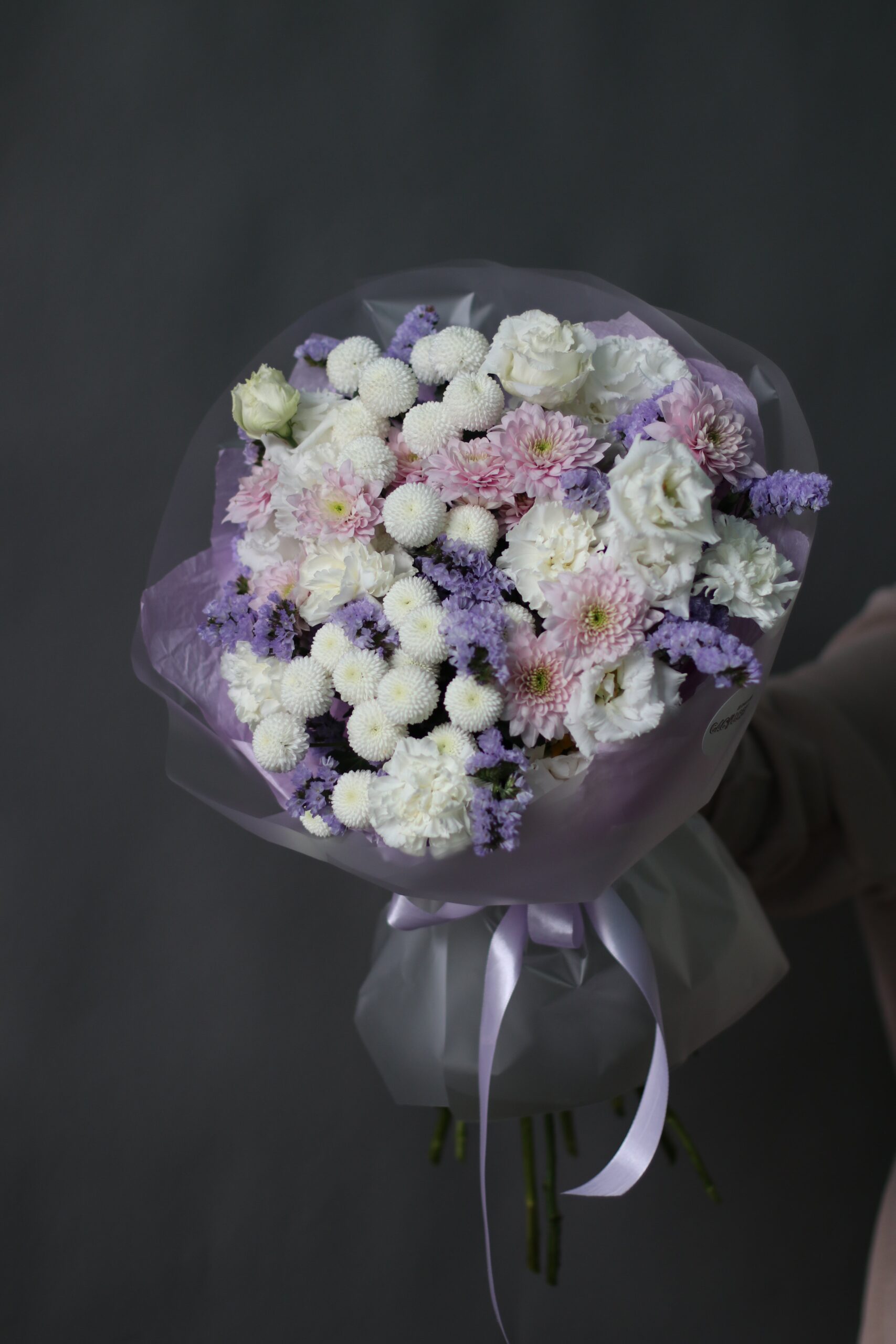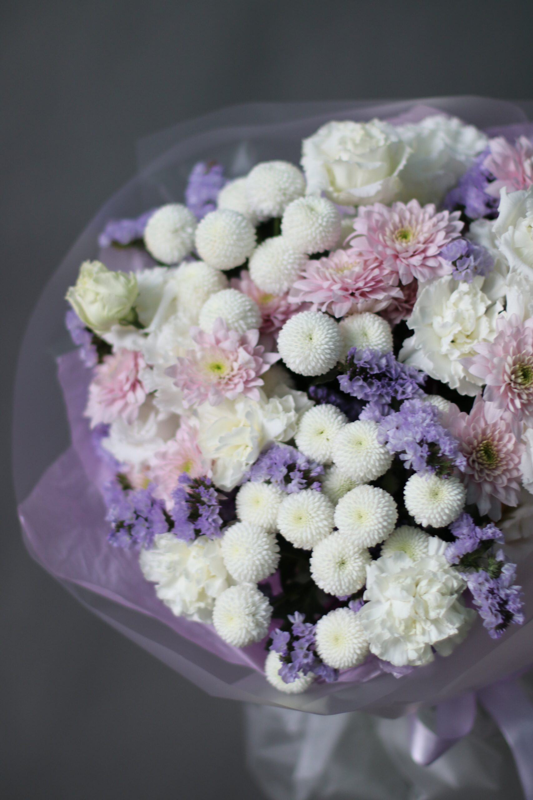 Букет без роз? А почему бы и не ДААА! Лавандово-белая охапка у вас в руках. В состав букета вошли кустовые сортовые хризантемы, кружевная эустома, статтица и роскошные гвоздики.