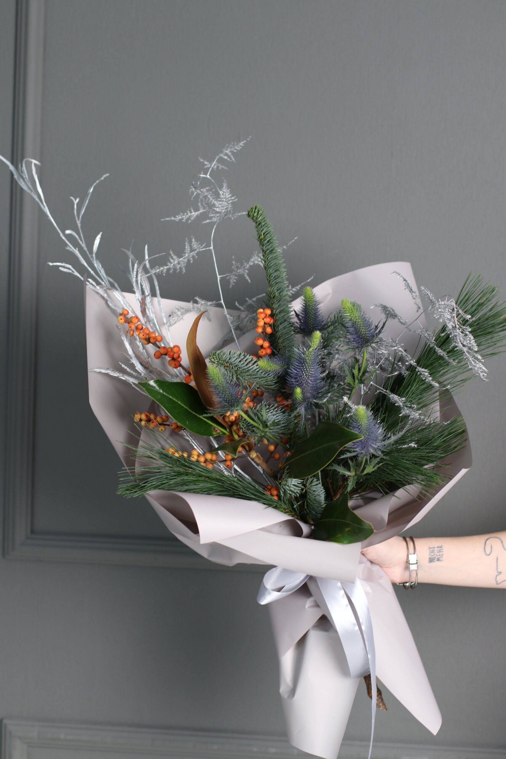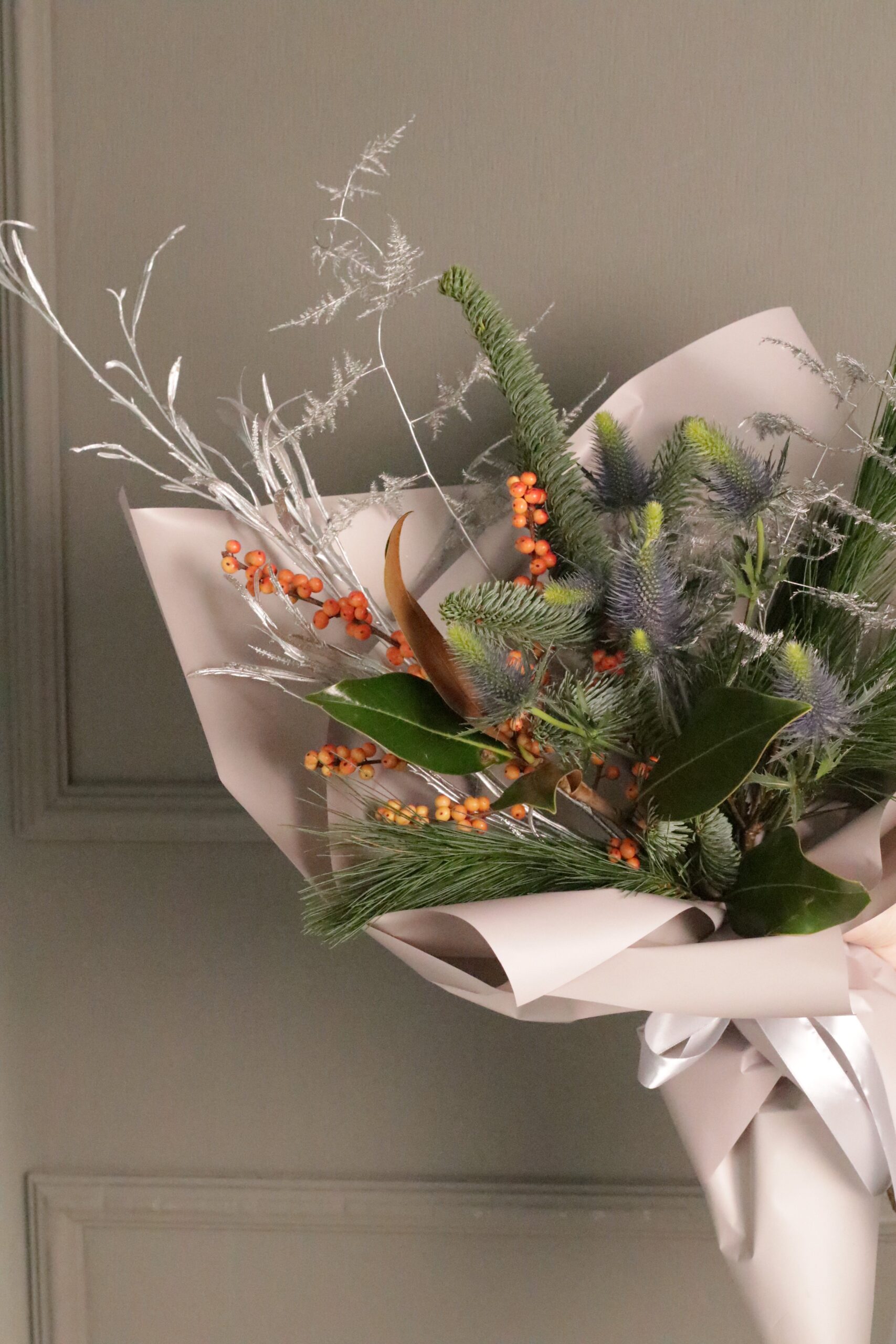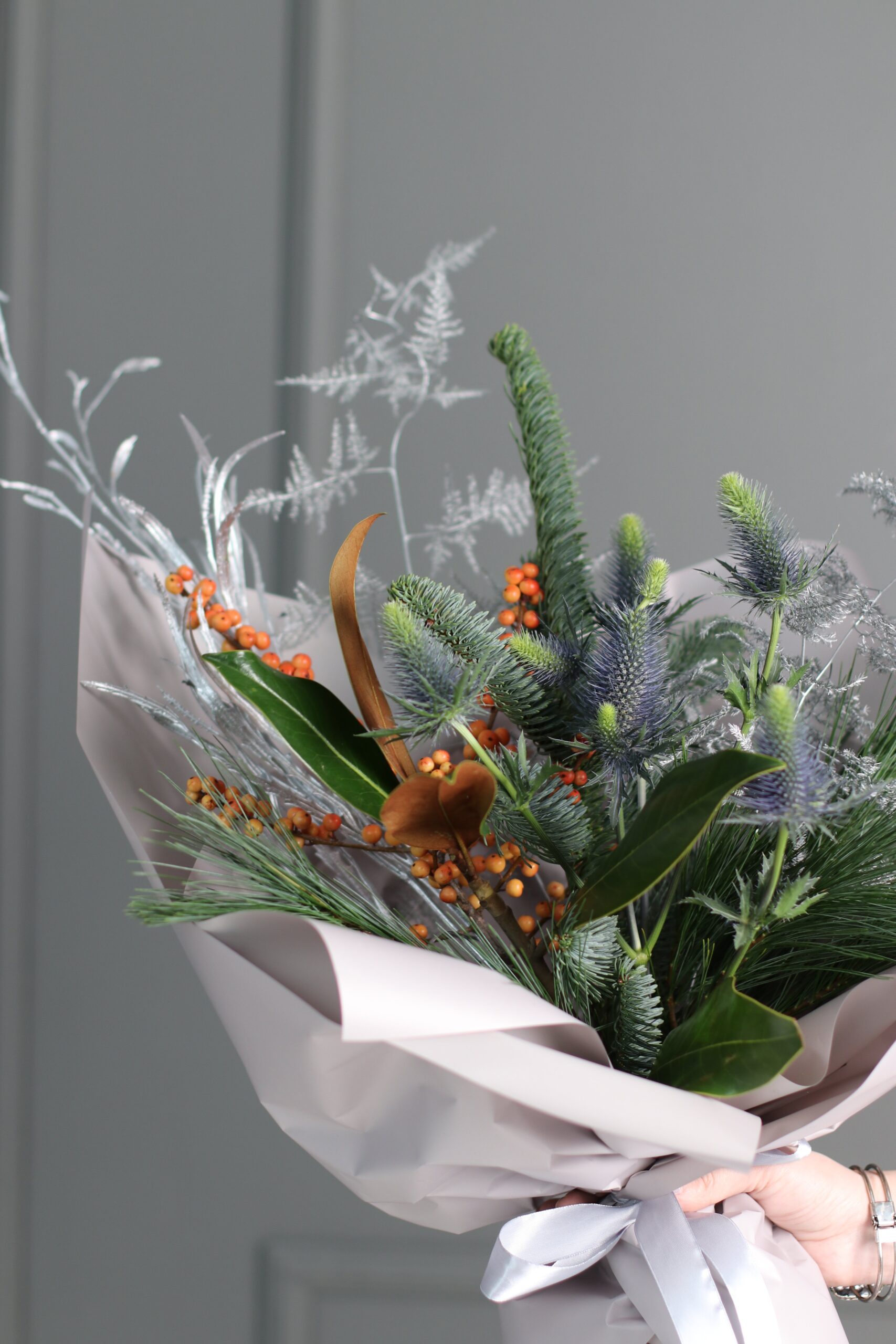 Продолжаем согревать вас и ваших близких ароматными зимними букетами. В составе абиес нобилис — датская пихта, ягоды илекса, эрингиум и ветка аспарагуса