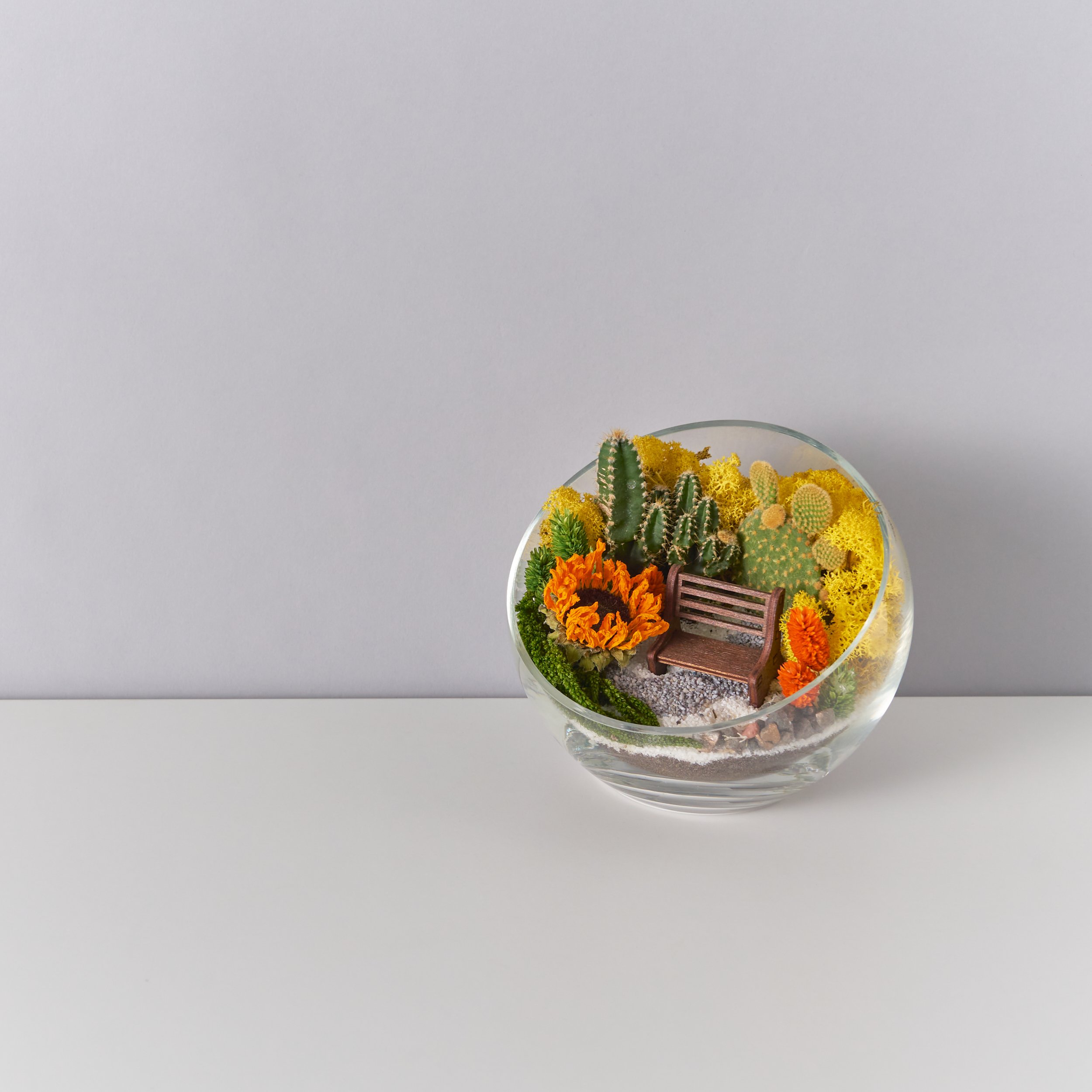 Освещение: Расположите мини-сад под ярким, рассеянным освещением южного или западного окна — прямой свет может обжечь некоторые из растений. В отсутствие таких условий композицию стоит разместить под фитолампой.