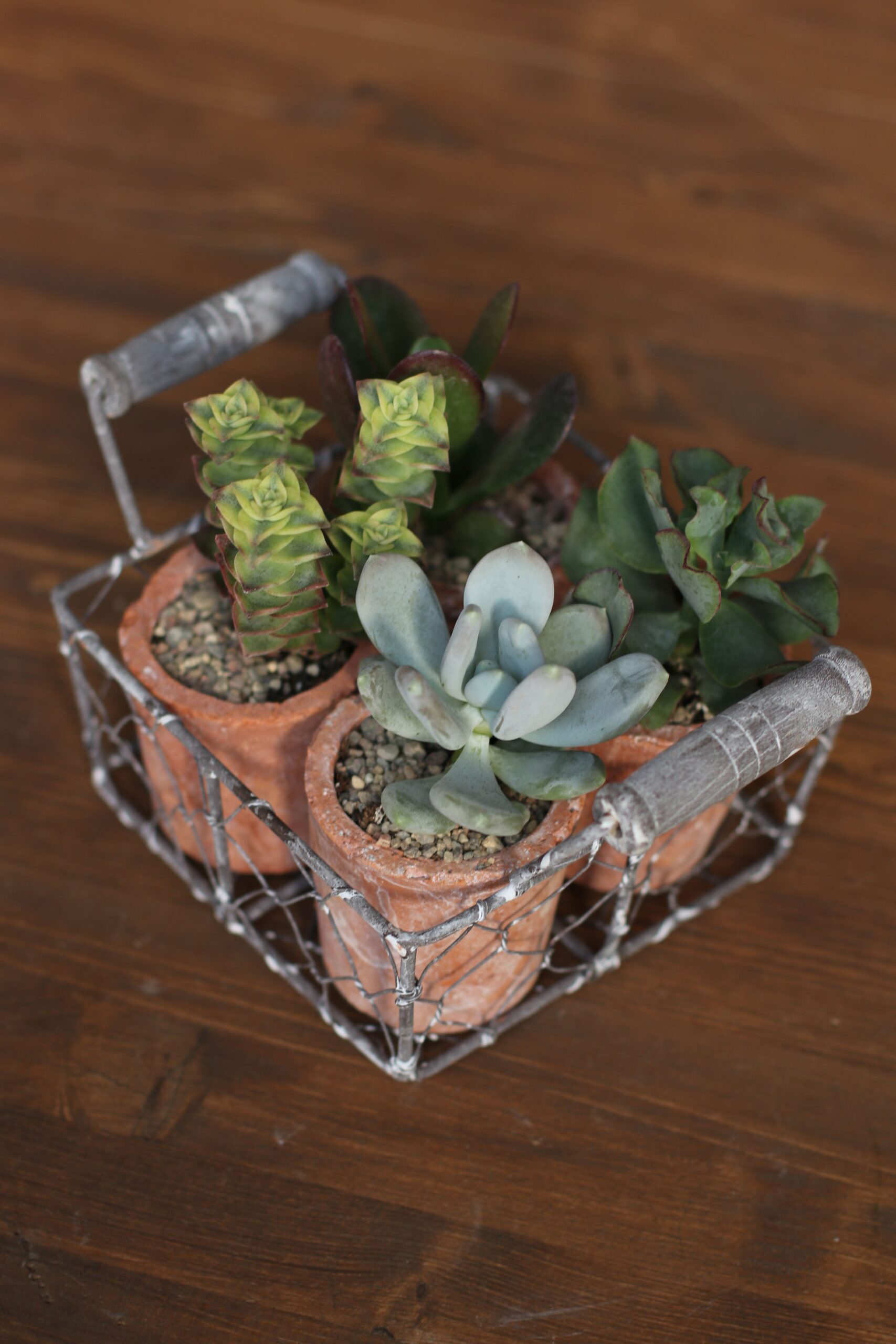 Набор из суккулентов — отличный вариант, когда сложно определиться с выбором. В наборе 4 разных суккулентика, 4 глиняных горшочка и классный подносик.