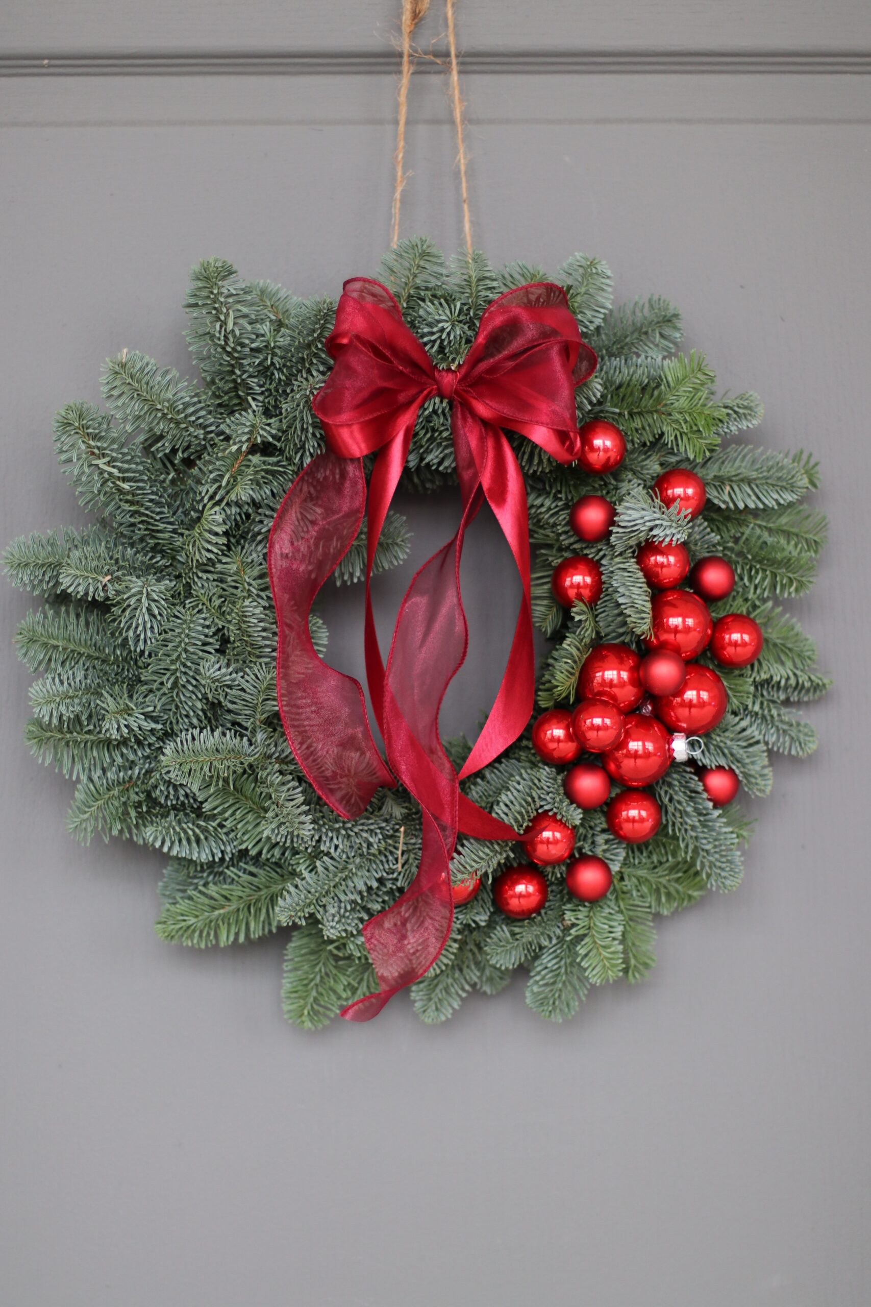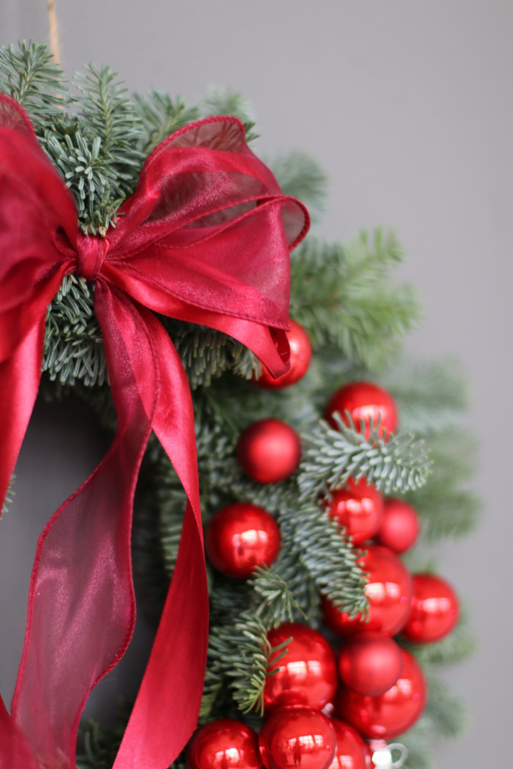 Рождественский классический венок в новогоднем красном цвете! В состав венка вошли-натуральная основа, натуральная датская ель, которая не осыпается со временеи и новогодние шары.