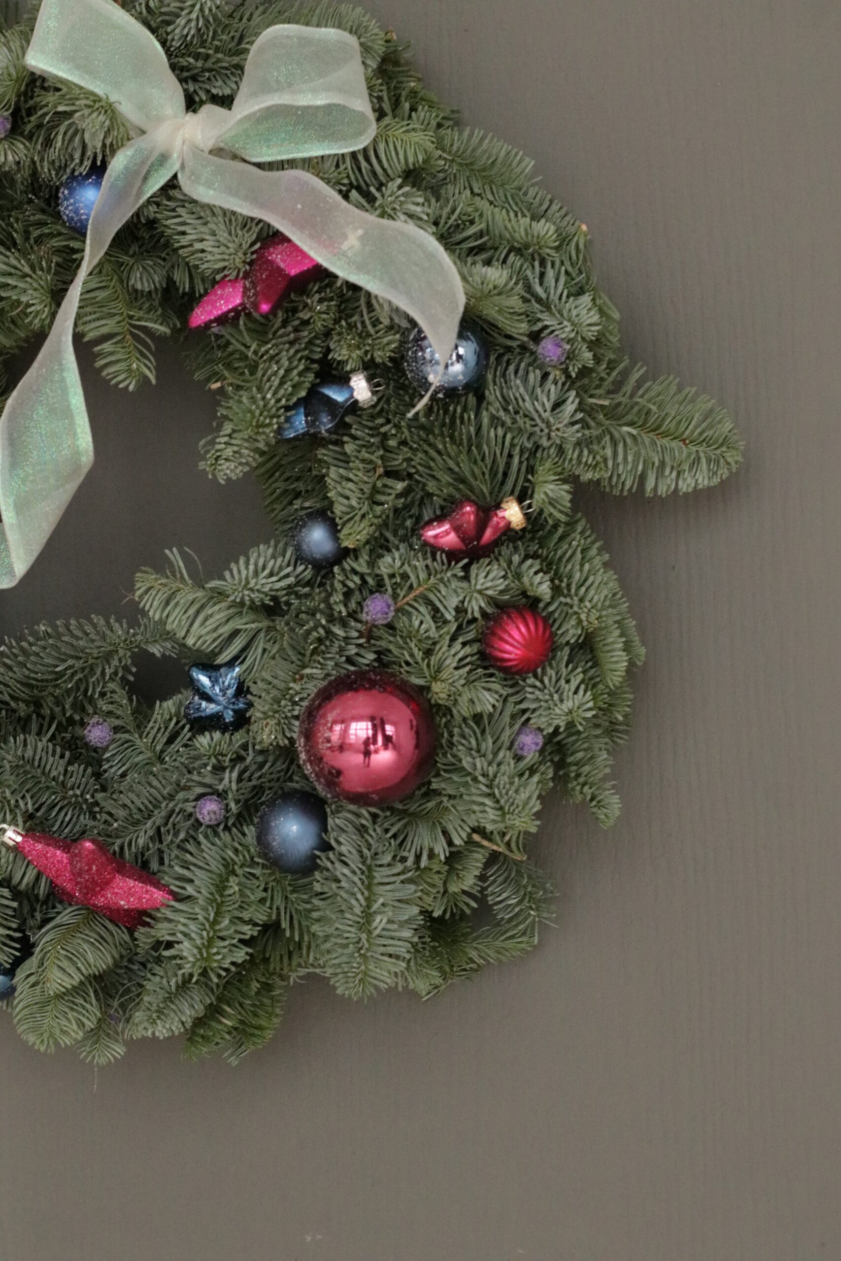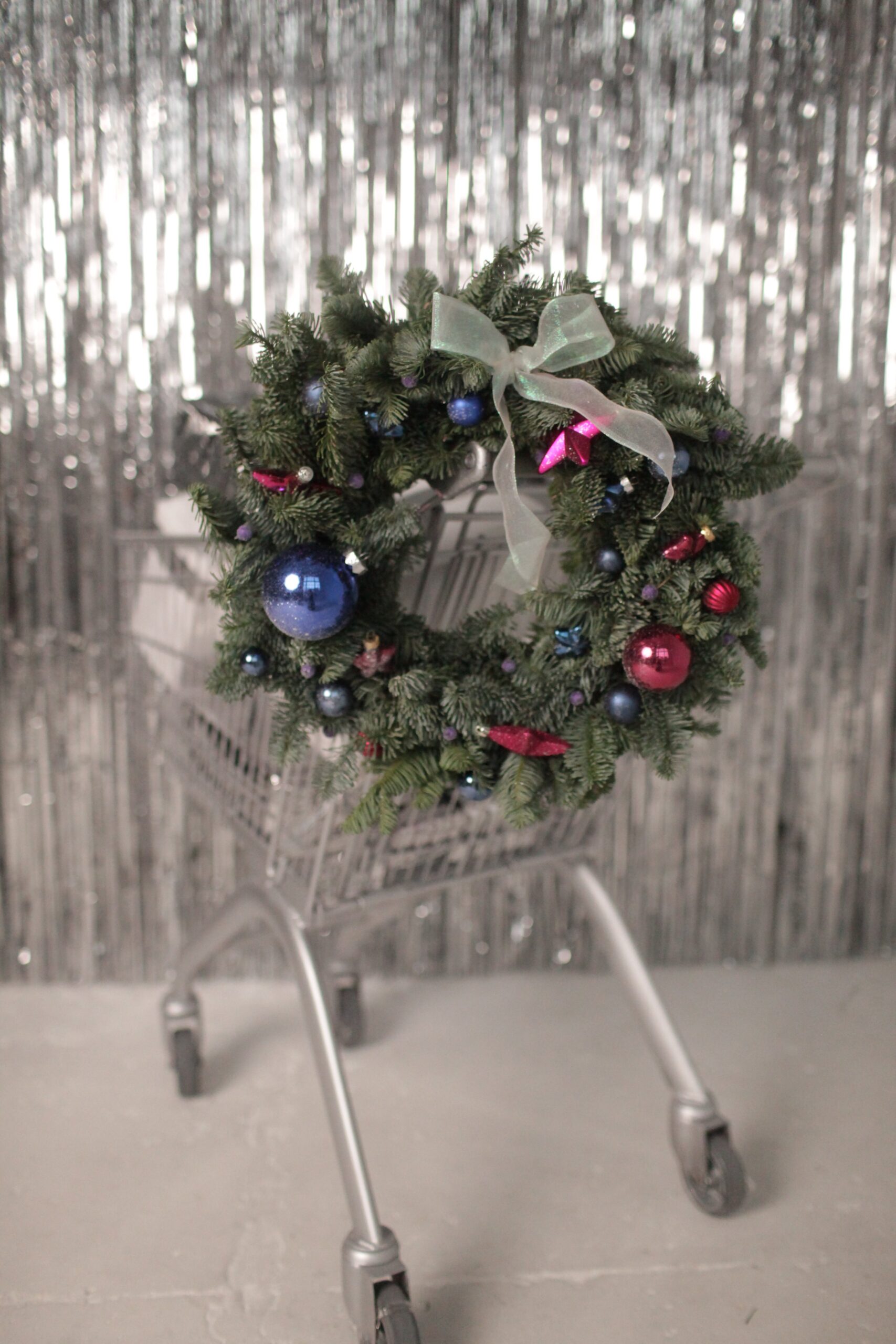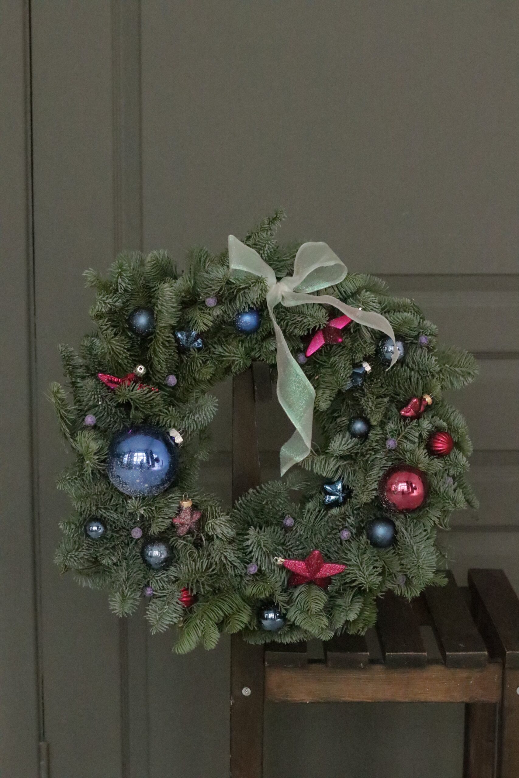 Рождественский венок в состав которого вошел стойкий нобилис, стеклянные шары, звезды ярких оттенков. Диаметр венка 50 см