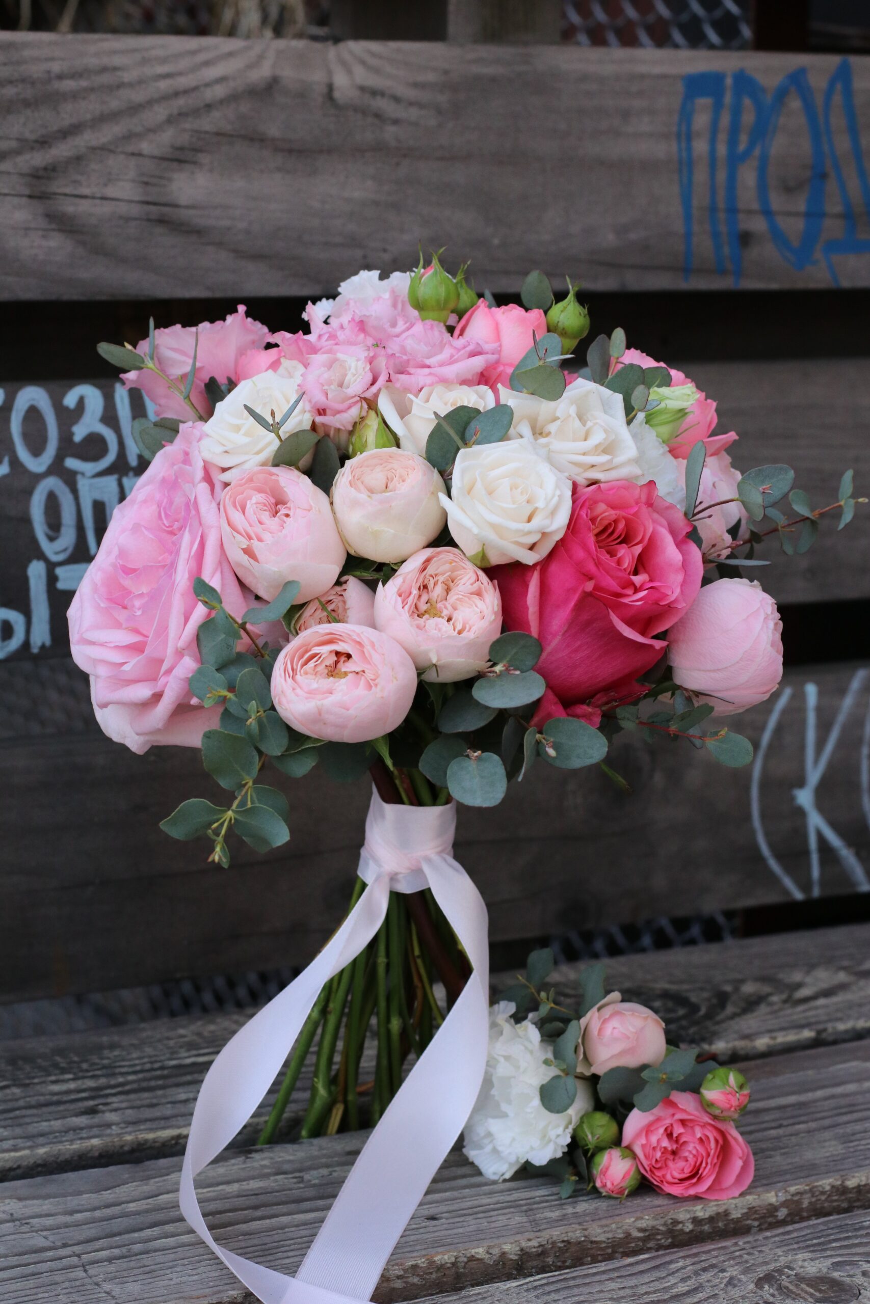 Букеты для самых волнительных и трепетных дней в вашей жизни — свадебные букеты. В состав букета вошли несколько видов пионовидных роз сорта мэнсфилд парк, кружевная эустома, садовая роза сорта Пинк Охара, ветки эвкалипта.