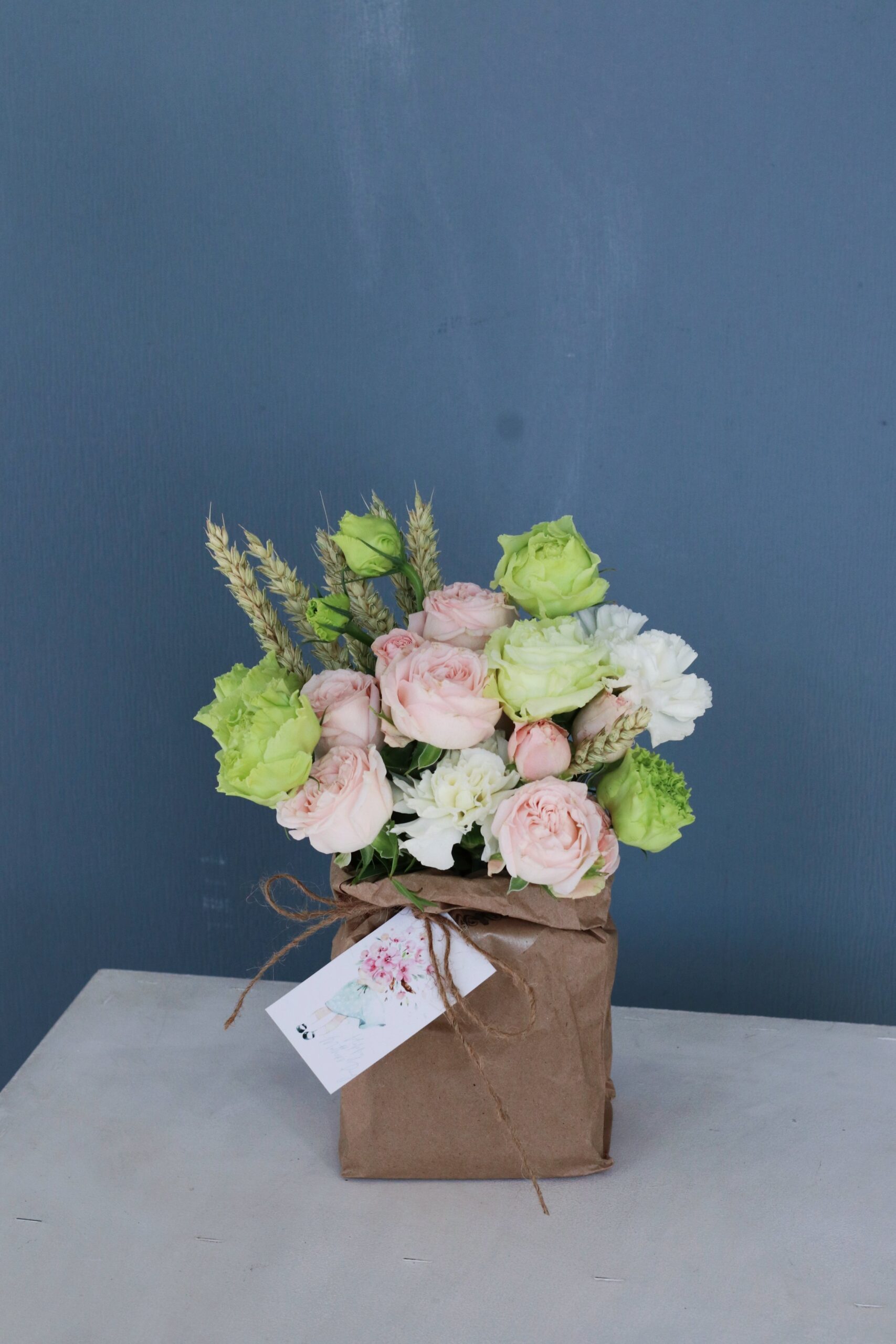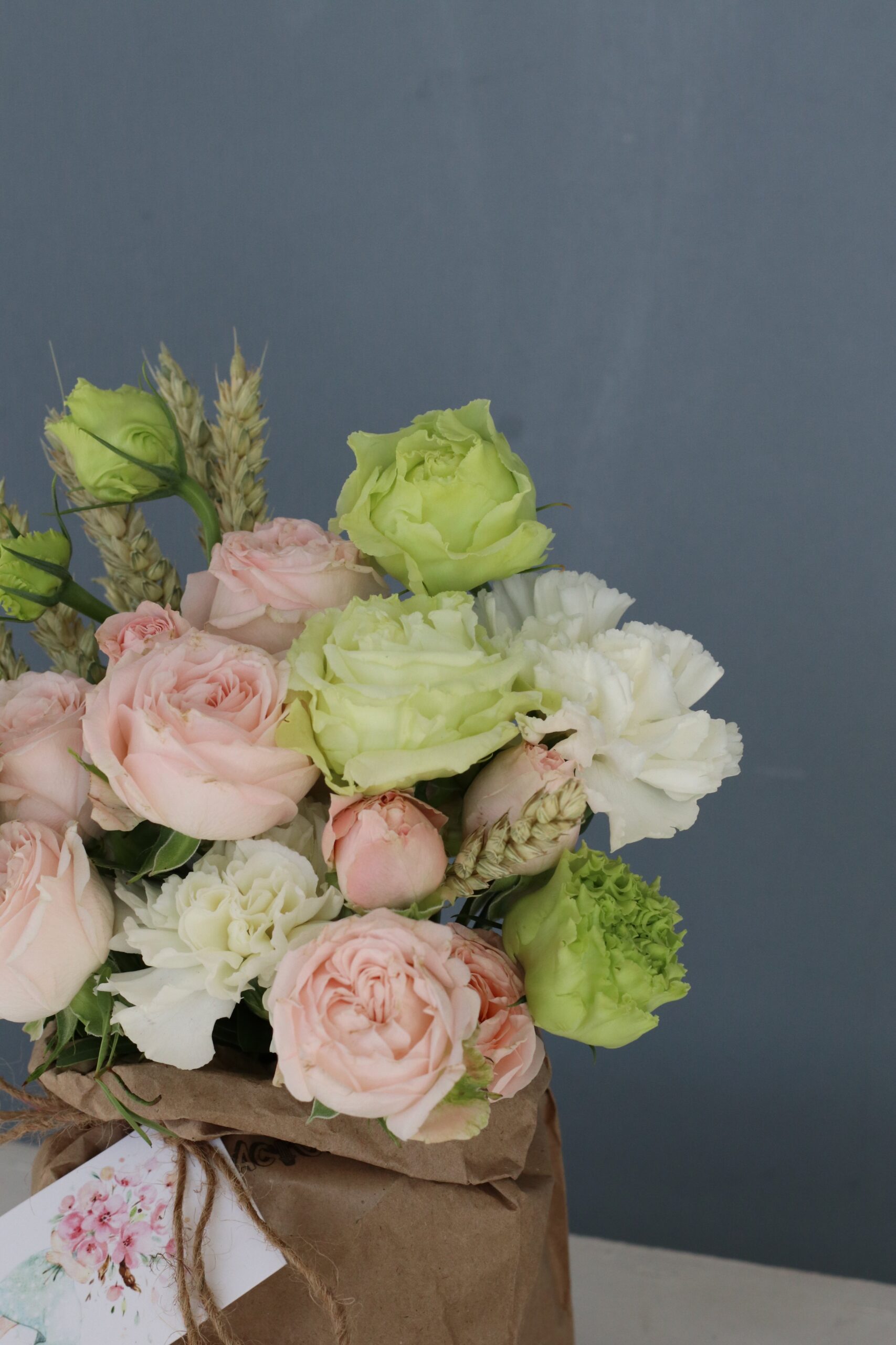 Свежая порция цветов для Ваших любимых. Поднимет настроение и день будет полон любви и романтики. Композиция выполнена на оазисе в экологичном крафт-пакете. В состав вошли пионовидные розы, кружевная эустома, говздика, сухоцветы.