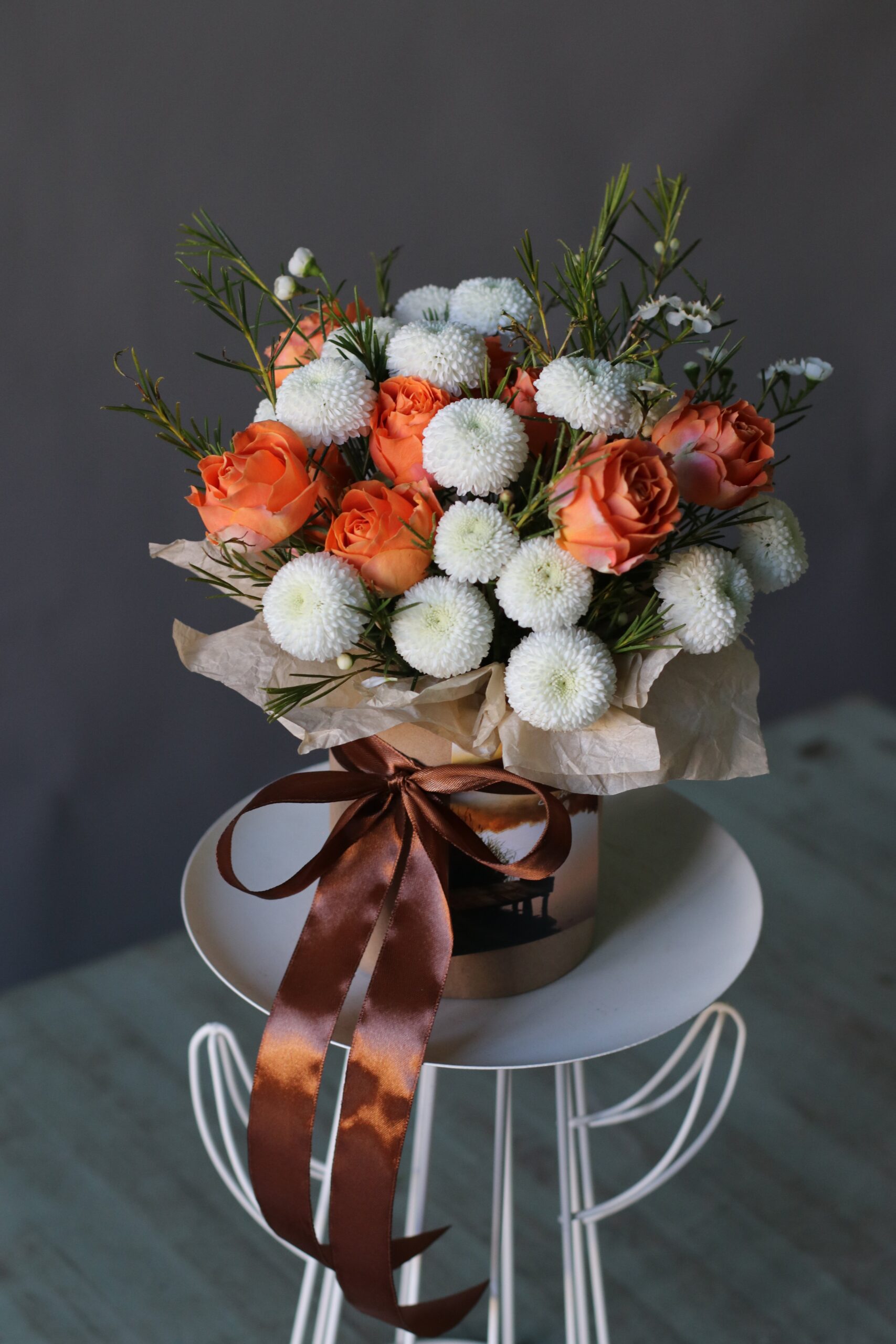 Яркая цветочная композиция для неординарных натур! В сочной шляпной коробке собраны пионовидные розы, хризантемы и хамелациум.